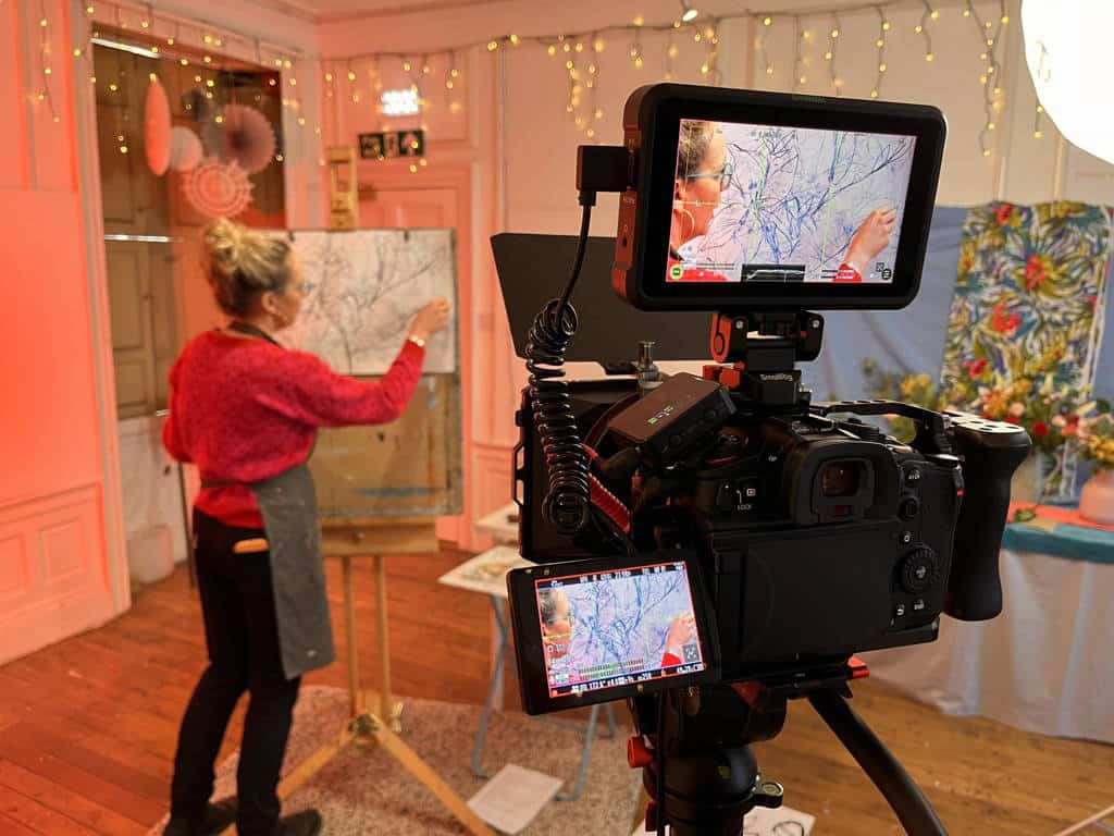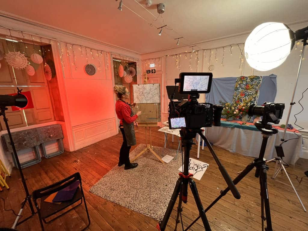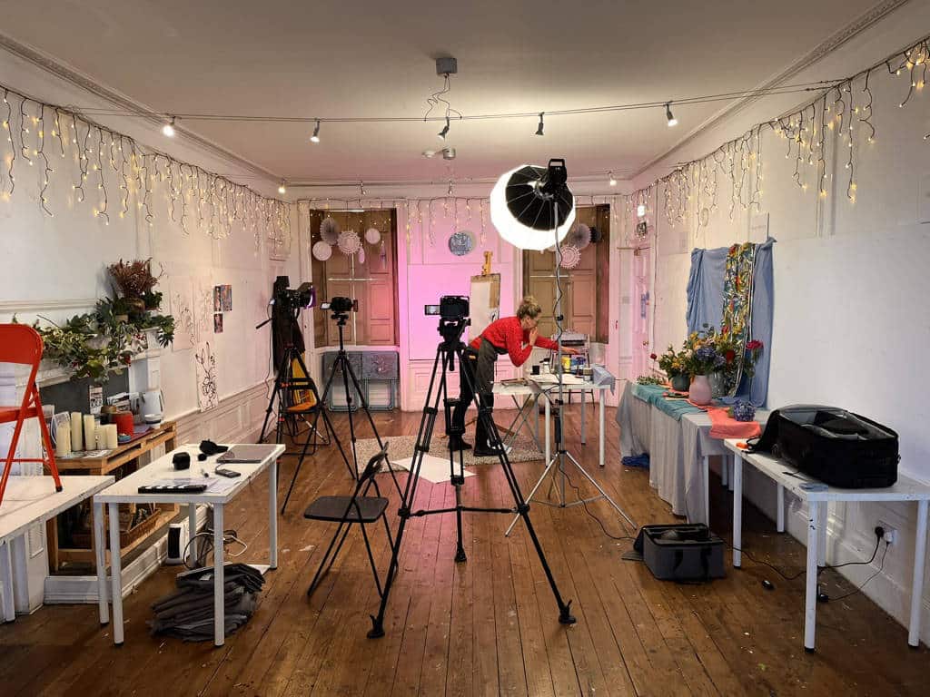 I proposed structuring the course into four lessons, with each lesson filmed as a multi-camera production. This included a wide shot to capture the full scene, a mid shot focused on the easel, and a close-up camera to record the finer details of the artistic process. The set was lit using a lantern softbox to provide smooth, even lighting on both Jemma and the easel, while the background was enhanced with coloured gels—one for each lesson—to help visually distinguish the individual sections.